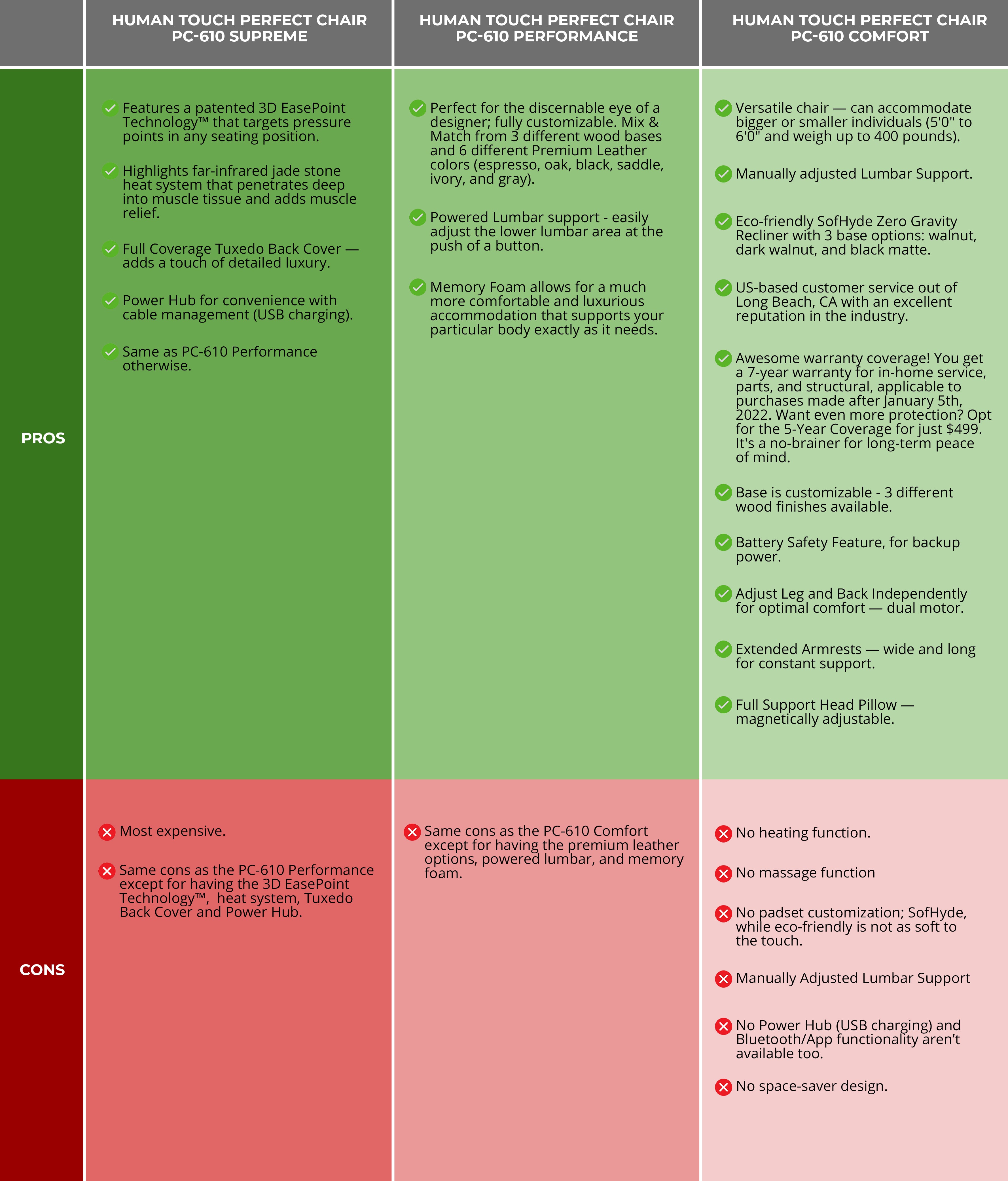 Throughout this review, we'll explore the features, pros and cons, FAQ’s and customer feedback for each variation of the Human Touch Perfect Chair PC-610 Zero Gravity Recliner. Let’s take a closer look at each model and help you decide which one is best for you.
