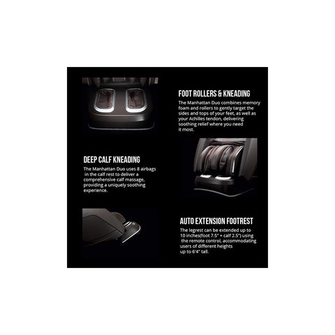 The Manhattan redefines luxury massage with its advanced dual-track system, making it the worthy successor to the Vigor, Hilux, and Emperor. Its intelligent smart scan and isolation mode deliver targeted, precise relief, while the cutting-edge mechanism ensures a smooth, refined massage experience. Beyond function, the Manhattan impresses with sleek aesthetics, resembling a premium leather recliner that seamlessly complements any space. Suitable for up to 6'4" and 260 #.