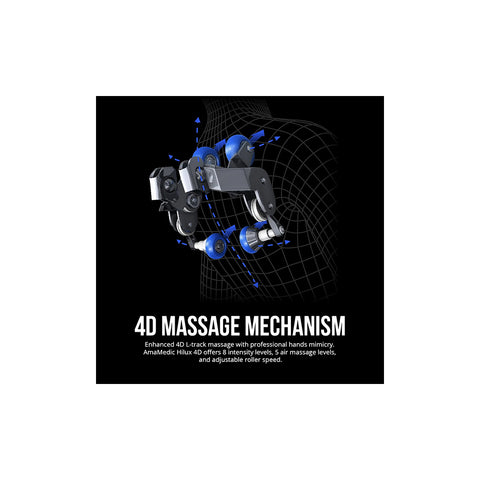 The AmaMedic Hilux features the same roller mechanism that you know and love from the Maestro -- an advanced 4D SL Track w/ heated IR rollers, superior foot rollers, Intensity Dial (instead of quick control keys) and a touch tablet w/ wireless and USB charging. Similar to the Maestro line, however, it does not have the waist airbags and slightly different aesthetics. Suitable for people up to 6'3' and 270#.