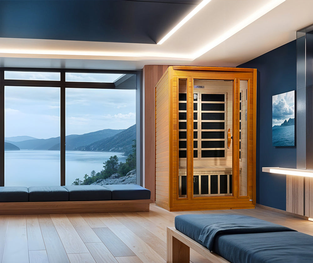 Dynamic San Marino Elite 2-Person Ultra Low EMF FAR Infrared Sauna in Canadian Hemlock wall-mounted full-spectrum heater panel.