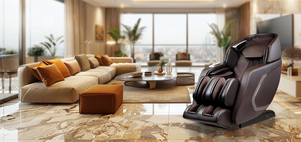 Osaki Os-Pro 4D Encore Massage Chair in Brown Color; lifestyle image in a grand living room from Wish Rock Relaxation