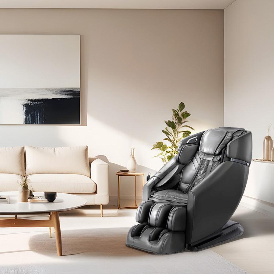 Infinity Riage 4D Massage Chair in Black Color; lifestyle image in a simple but cozy living room from Wish Rock Relaxation