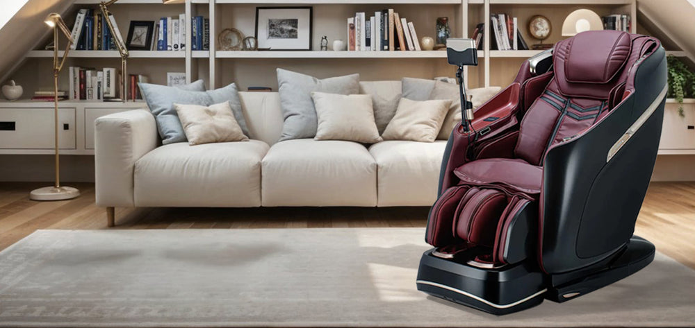 JPMedics KaZe Duo Massage Chair in black/burgundy and black finish shown in a cozy modern living room setting from Wish Rock Relaxation.