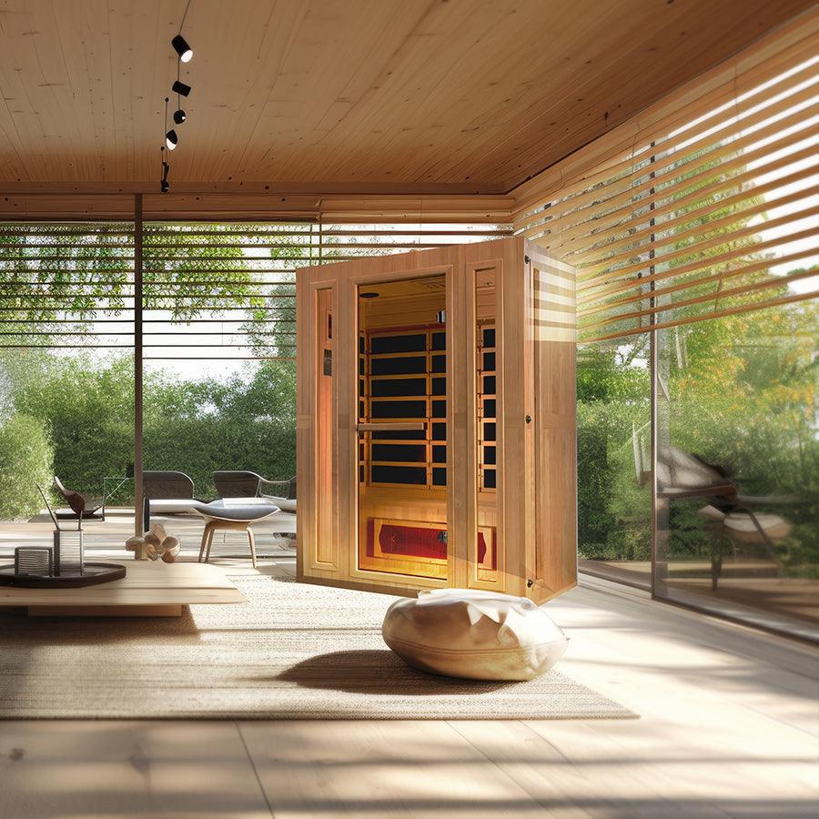 Get cozy in the Maxxus "Trinity" 3-Person Infrared Sauna! 7 Carbon & Ceramic Tech Panels, LED Controls, Chromotherapy, Music System with Bluetooth, Canadian Hemlock, 120V/20A Plug & Play - Relaxation for you and your crew!