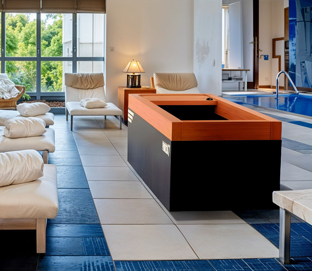 Medical Breakthrough Frozen 7 Cold Plunge with wood trim and built-in cooling system in modern outdoor patio from Wish Rock Relaxation.
