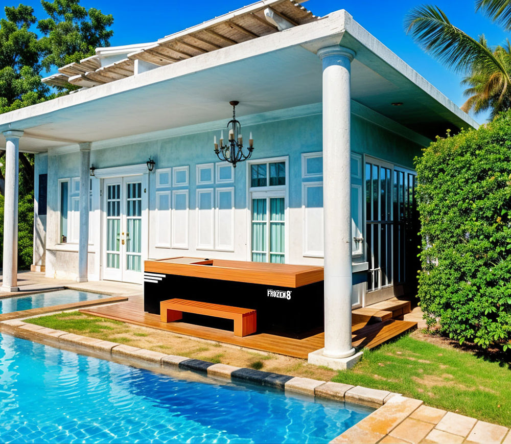 Medical Breakthrough Frozen 8 Cold Plunge with wood trim, integrated cooling system, and matching bench in luxury outdoor patio from Wish Rock Relaxation.