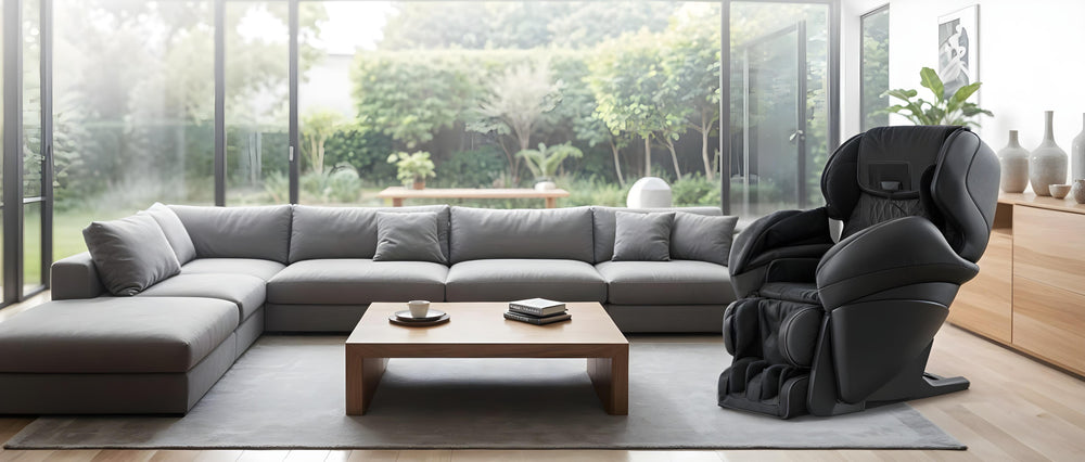 Panasonic MAK1 4D Massage Chair in Black color; Lifestyle image in a serene living room from Wish Rock Relaxation